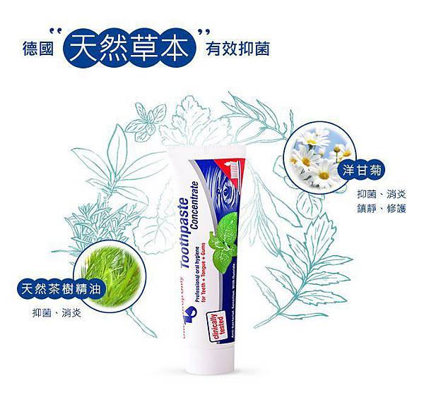 德國 One Drop Only 漱佳濃縮牙膏,配方主要以植物草本抑菌修護:茶樹與洋甘菊,